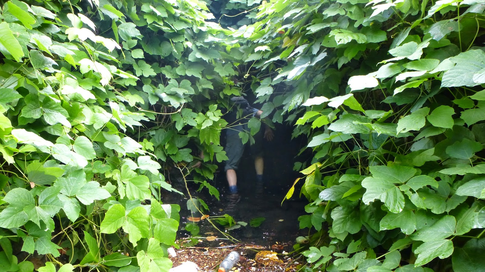 Sunday, while visiting a couple "dive bars" in West Asheville, we run into 2 members of the tunnel group. Upon further quizzing, we learn we were in the right spot the day before. However, after processing some of the responses, I figure these are just part of the storm sewer system. Nevertheless, we can't let this adventure not be fulfilled. Early Monday morning, we are headed to Asheville. The unposted parking area next to a favorite drinking spot for homeless folks and a small creek is our destination. We wait until there is no one present and head down into the creek hidden by kudzu.